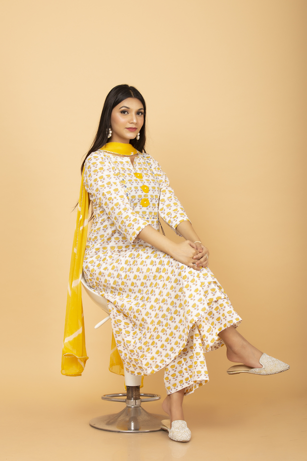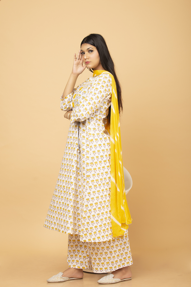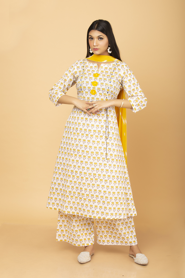 This is an exclusive suit in Pure cotton hand block lotus print with gota embroidery and organza flowers. It has 3/4 sleeves and a boat neck. Plazzo is straight. It is coupled with beautiful Leheriya chiffon Dupatta.