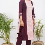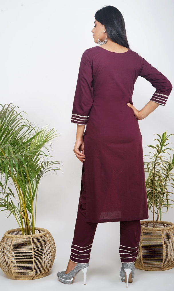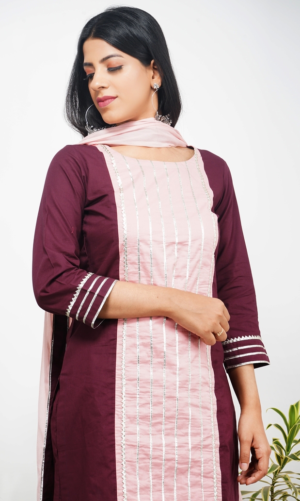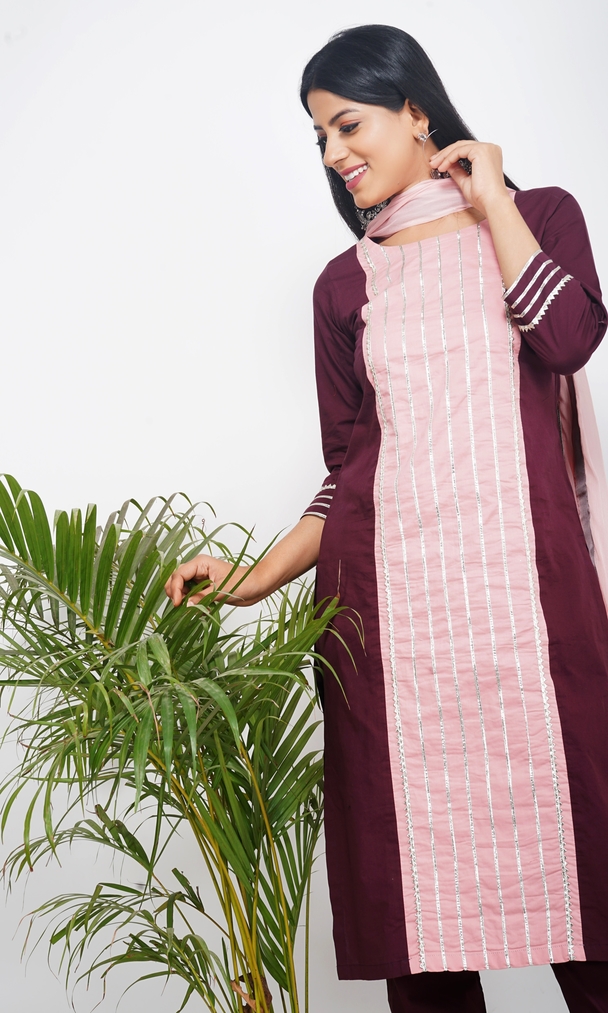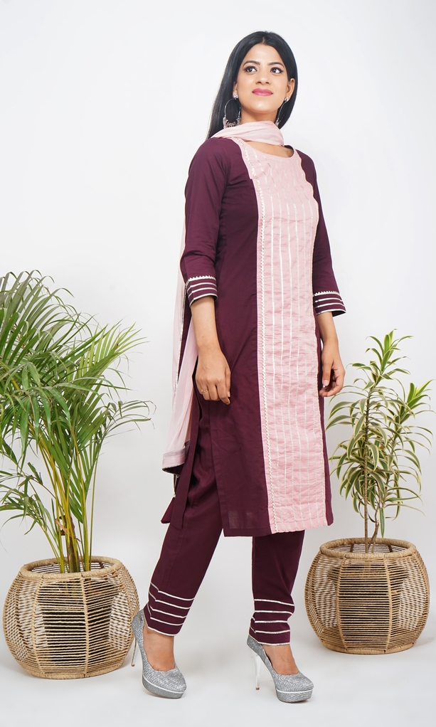 It is a Wine and pink gota patti suit set. Suitable for daily wear. Fabric is Pure cambric cotton and dupatta is of fine quality Pure chiffon. Neck is round and sleeves are 3/4.