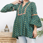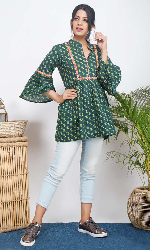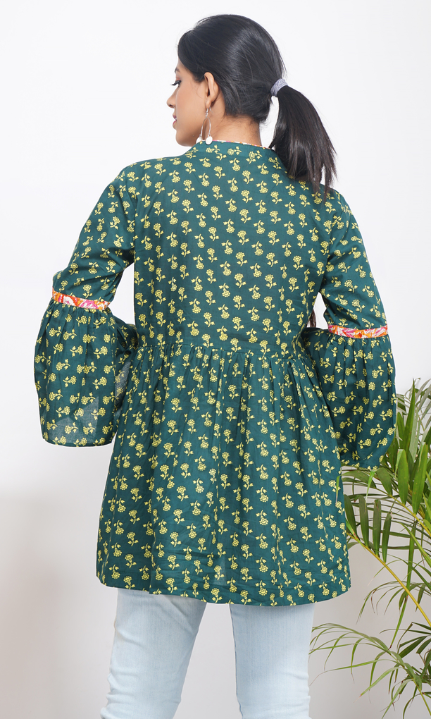 It is a bottle green Color Peplum top. Fabric is Pure Cotton. Neck is band Collar. Pattern is Gathered with frill sleeves.
