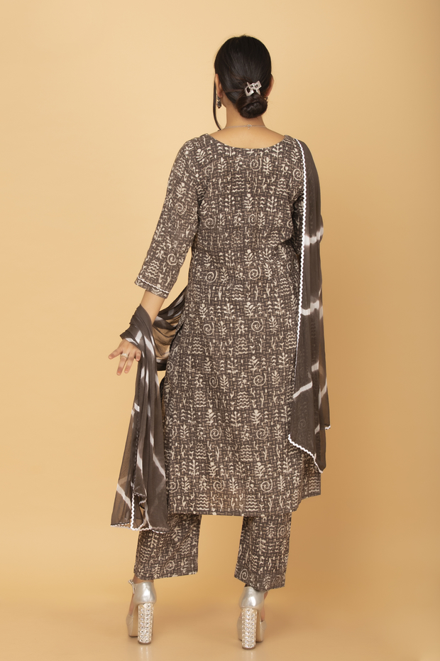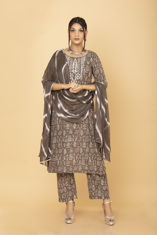 This is an exclusive suit in Pure cotton hand block print with Resham embroidery. It has 3/4 sleeves and a boat neck. Palazzo is straight. It is coupled with Leheriya chiffon Dupatta.
