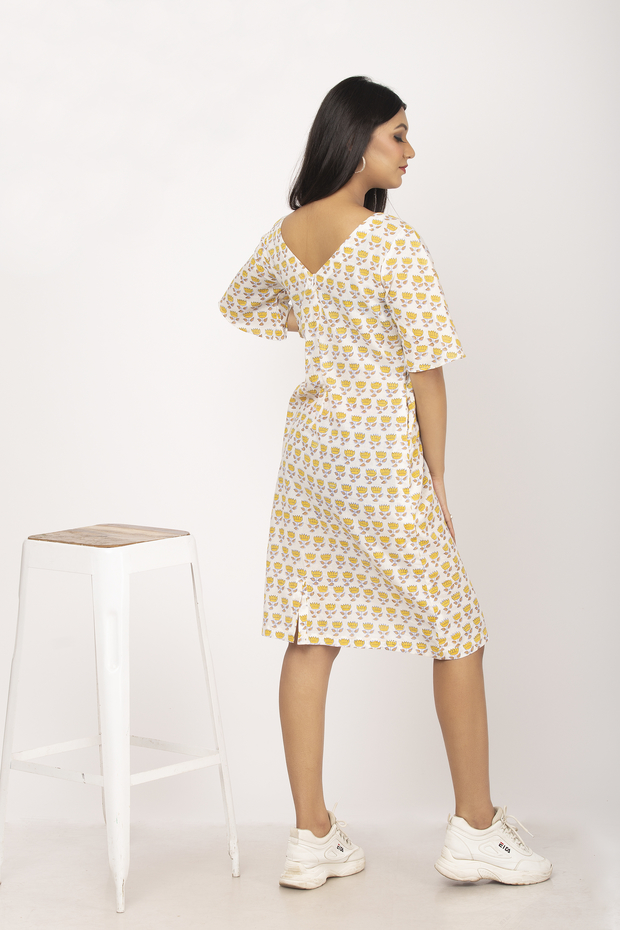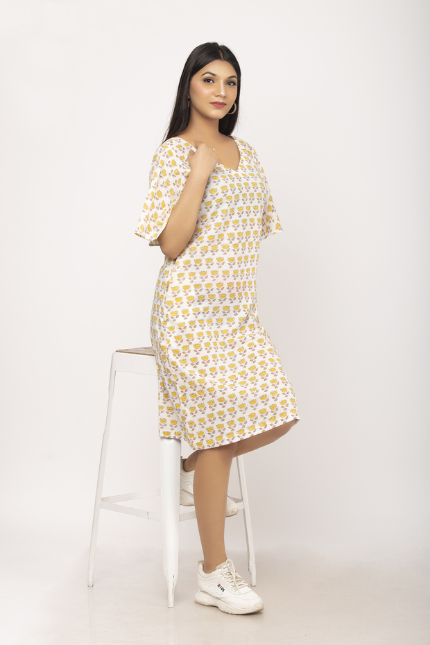 This is a One Piece Dress on Pure cotton Fabric with elbow-length umbrella sleeves. Back zip and back slit with V neck on Front and Back.