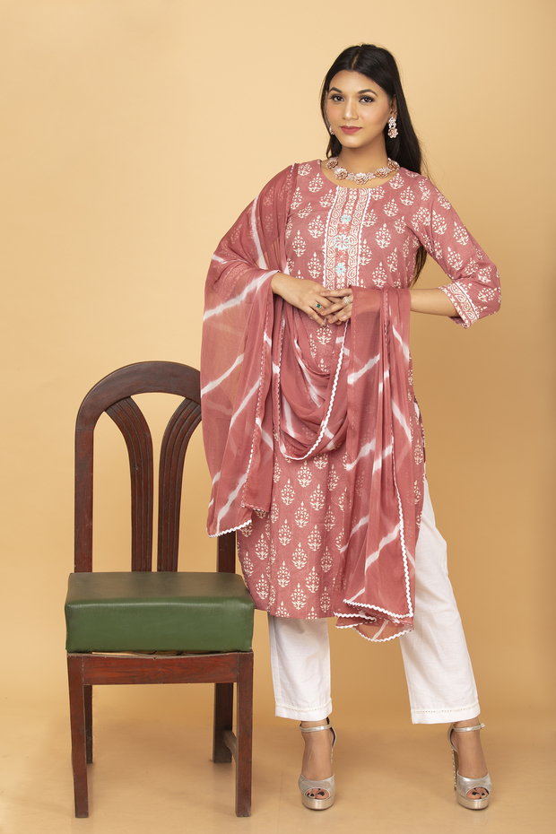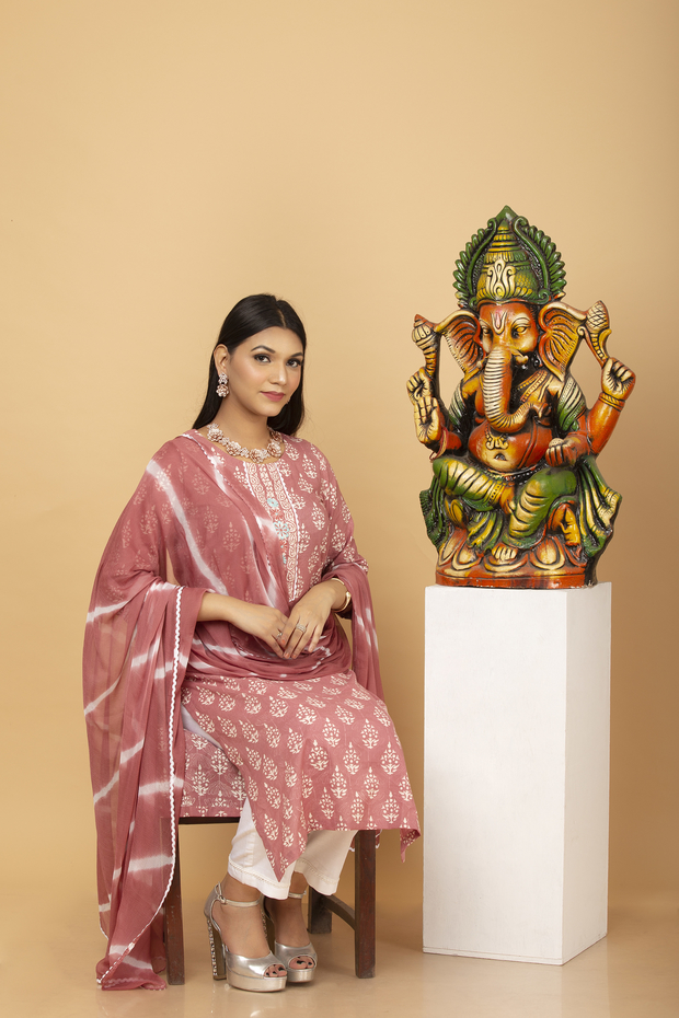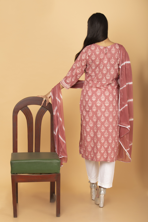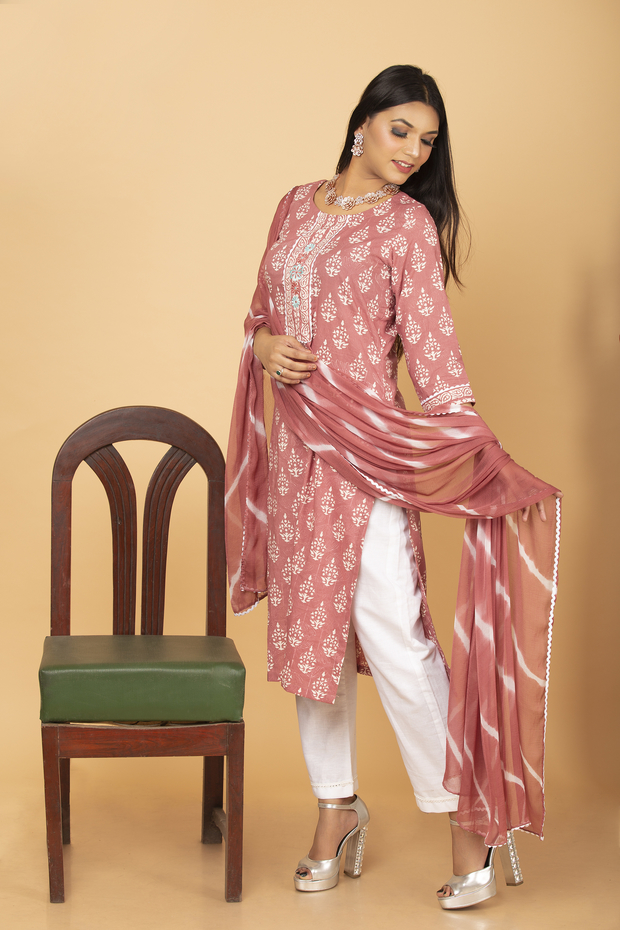 It is Pastel Peach Hand Block Suit Set with Resham and Lace work on Neck and Sleeves.