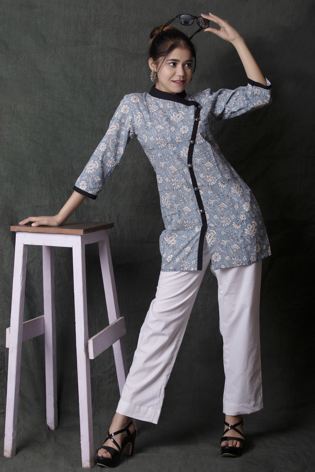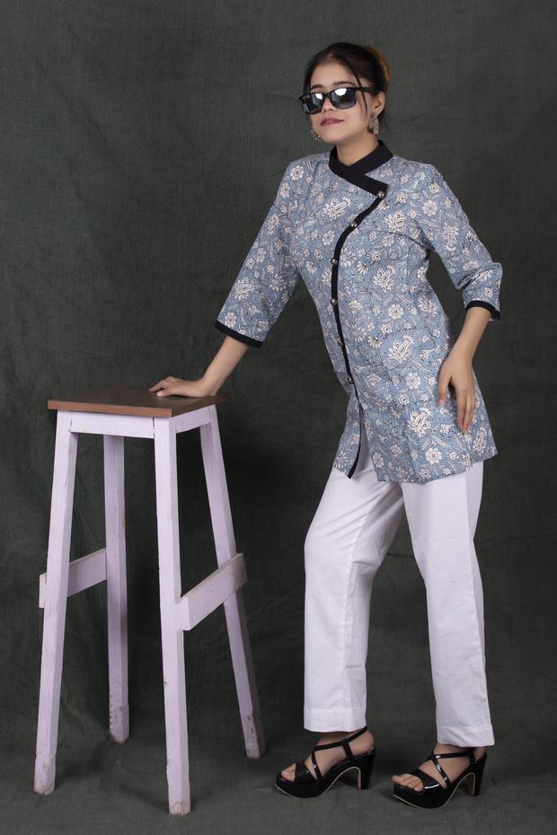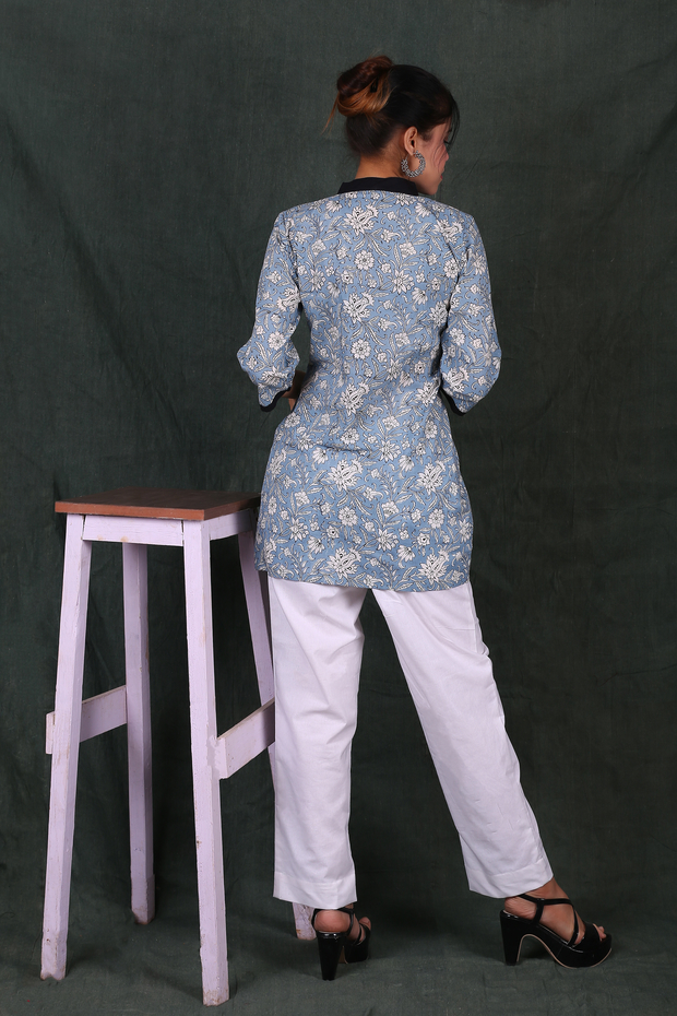 It is a Powder Blue Hand Block Short Top. Cotton Fabric. Ideal For casual and Office wear.