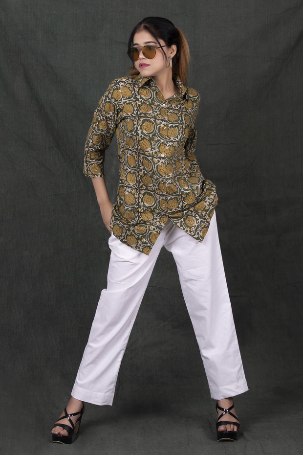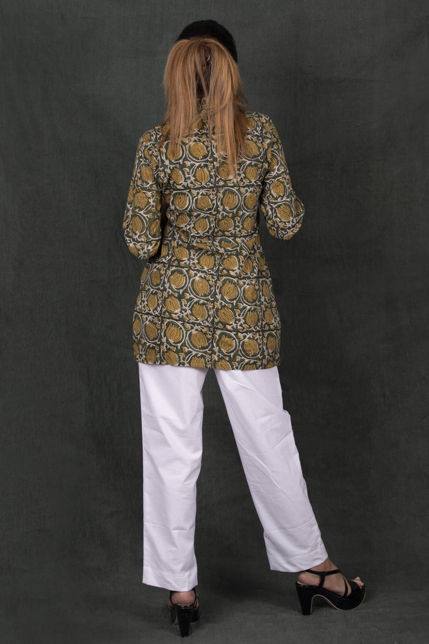 It is a bottle green floral Hand Block kurta. Cotton Fabric. Ideal For casual and Office wear. Available in Plus size. can be clubbed with white cotton trousers.