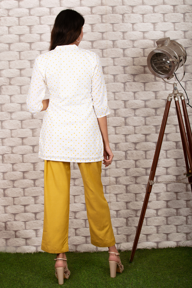 It is a yellow polka dot short kurta in Hand Block. Cotton Fabric. Ideal For casual and Office wear. Can be paired with Trousers. Plus size clothing or women.